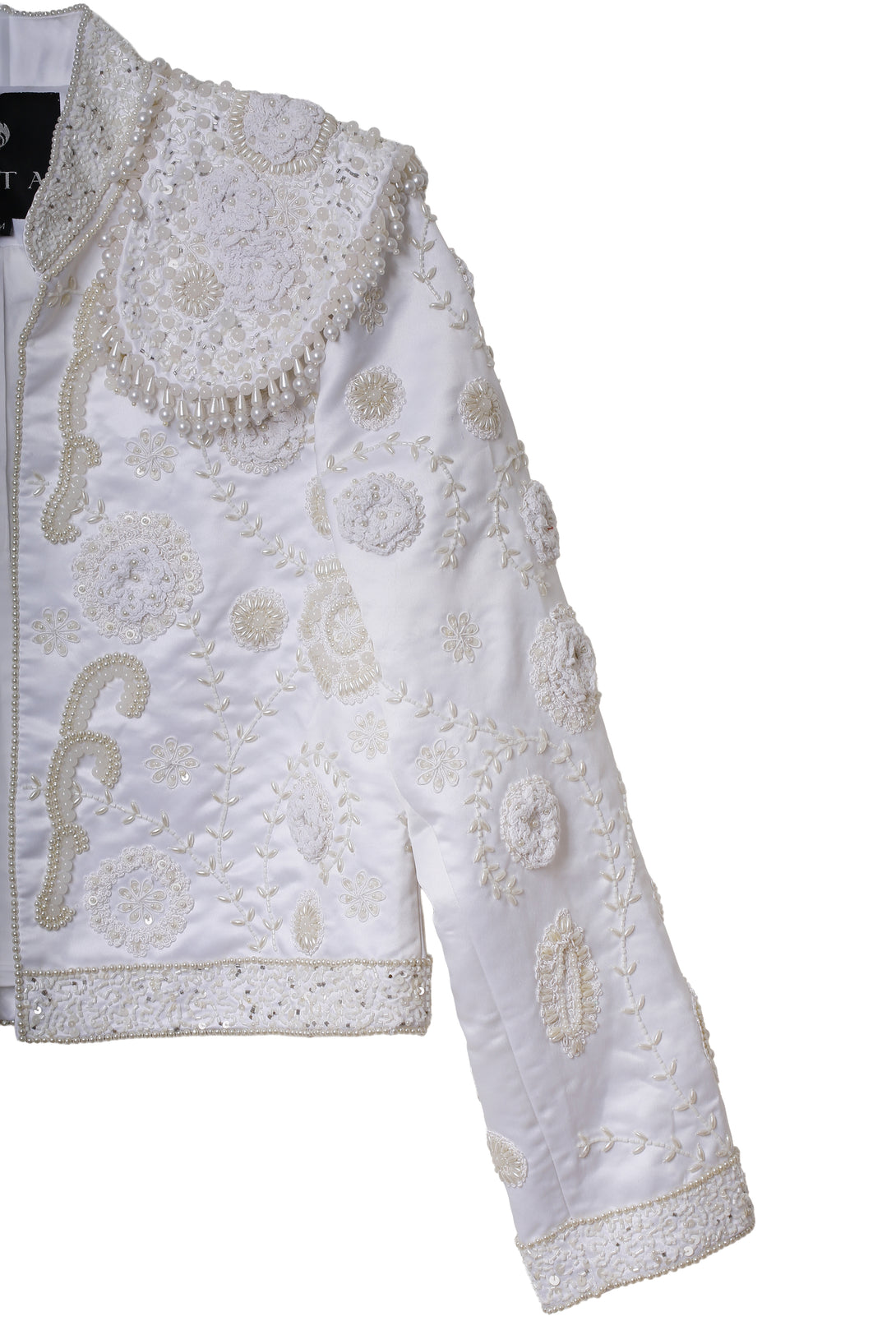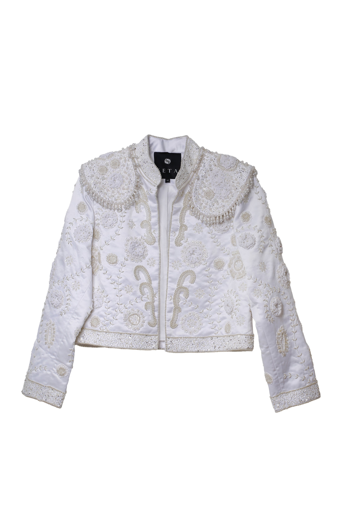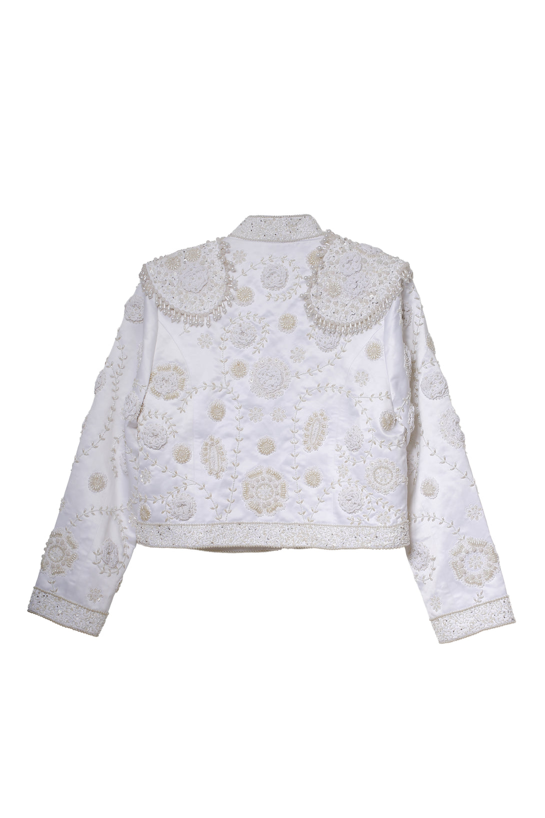 Una versión luminosa del clásico bolero, bordado completamente en hilo blanco con apliques en perlas y motivos florales. Esta chaqueta captura la esencia de la elegancia costera con un aire sofisticado y femenino. Su silueta estructurada, pero ligera, la convierte en el complemento perfecto para atardeceres de verano con estilo.