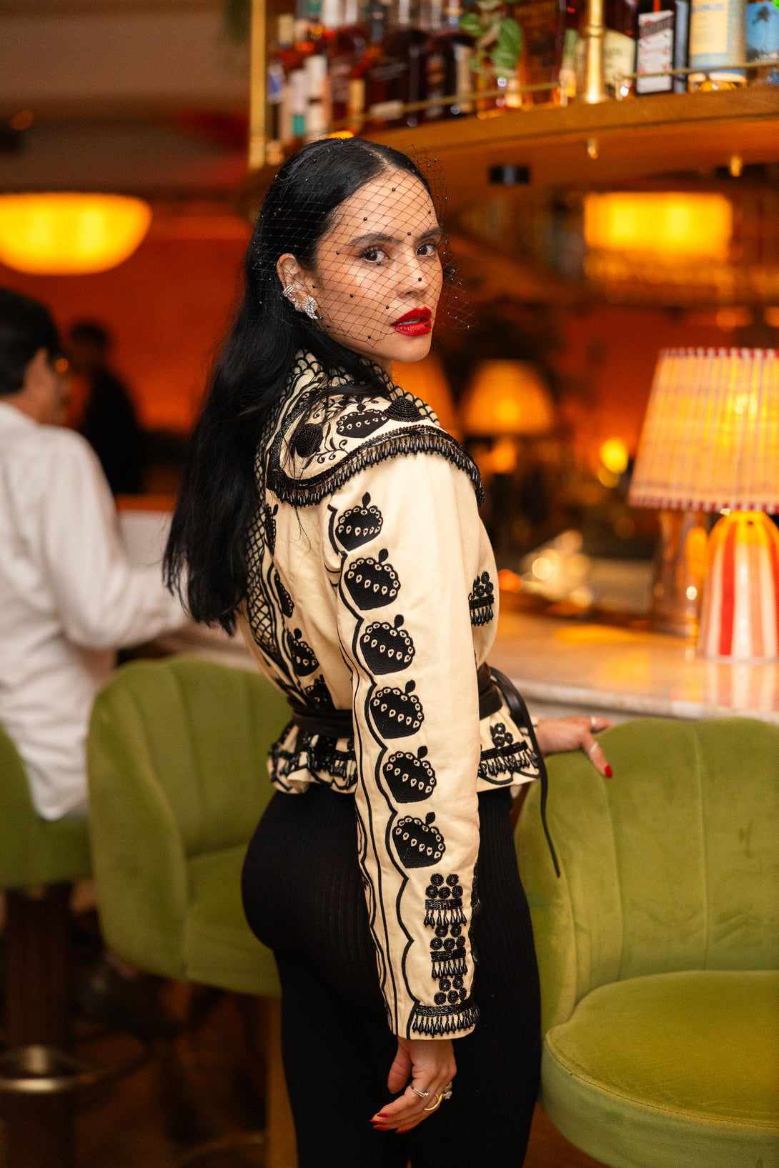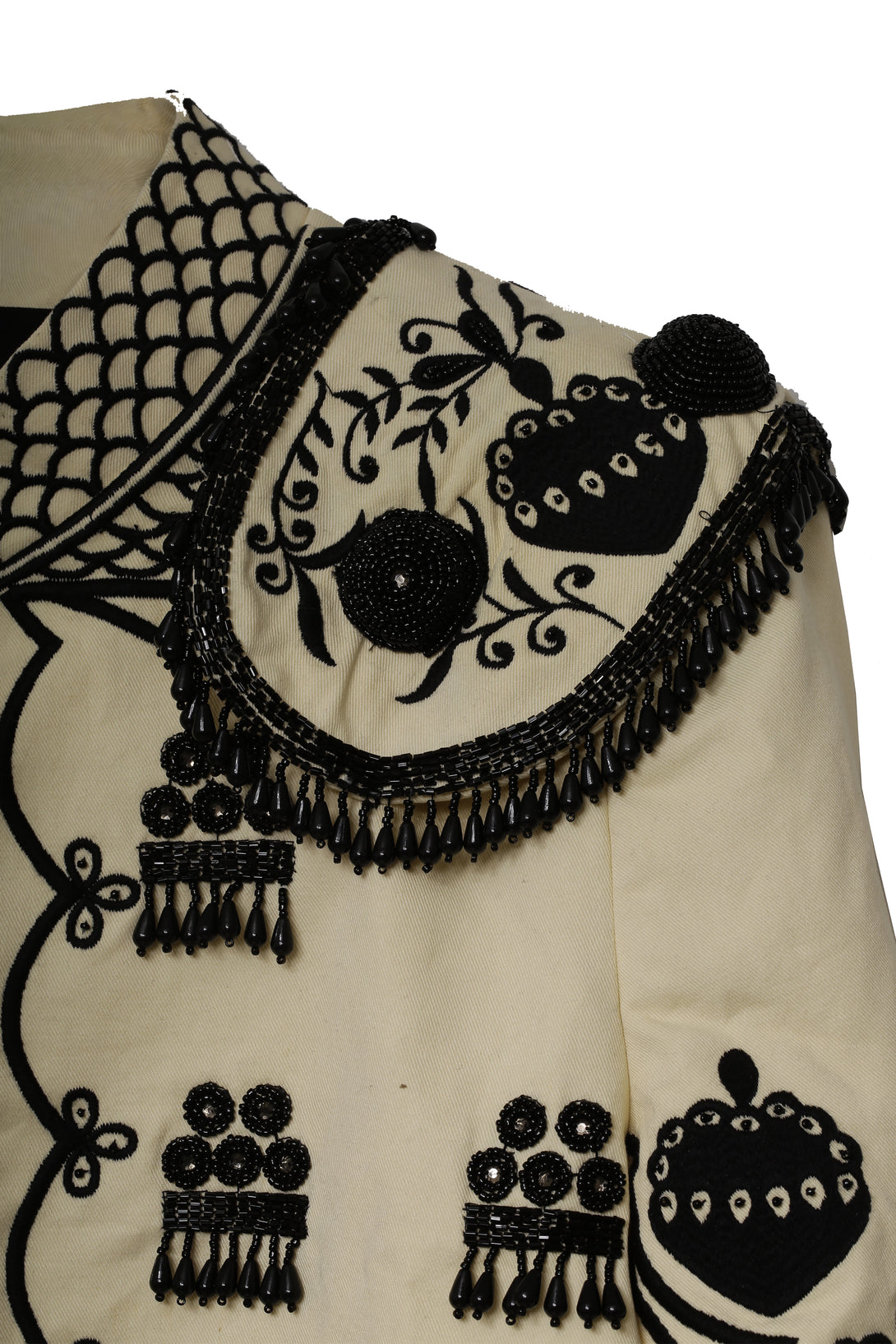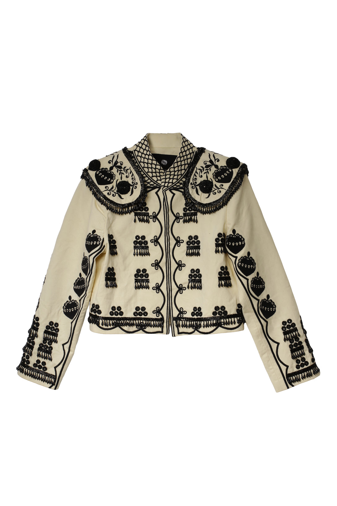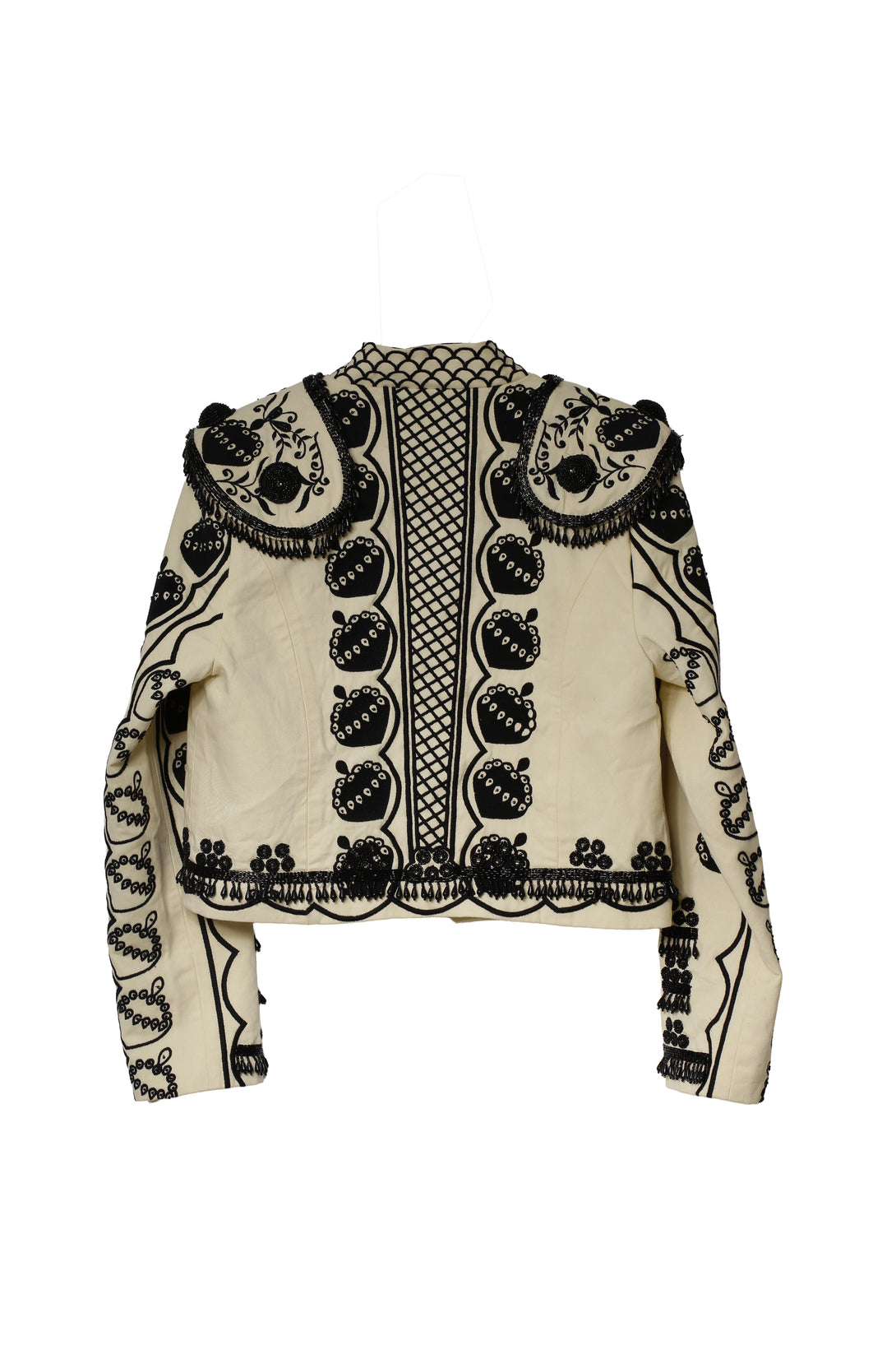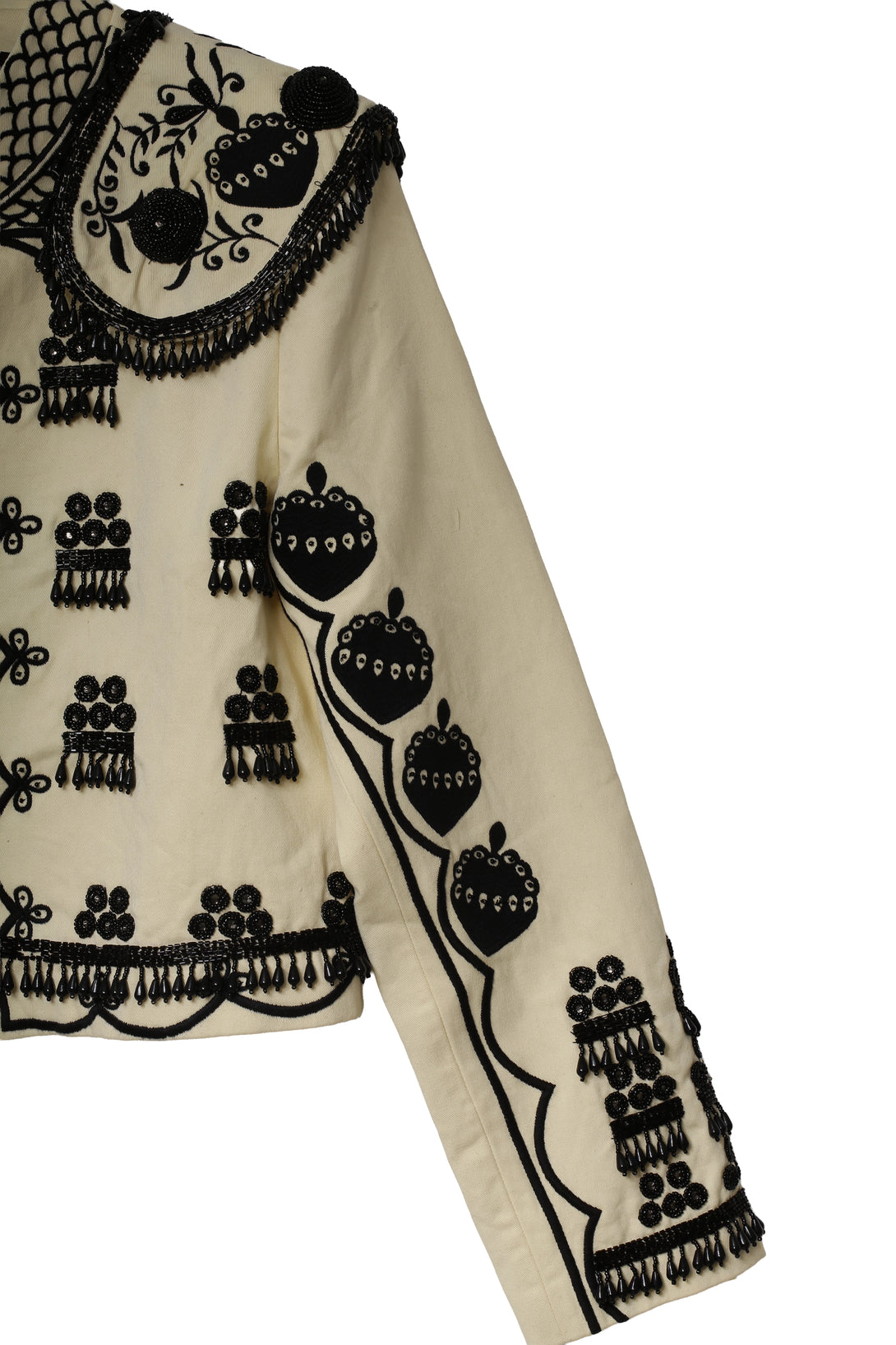 Esta chaqueta tipo bolero es una pieza de alto impacto visual. El contraste entre el fondo crudo y los bordados negros crea una silueta poderosa, sofisticada y muy SETA. Cada detalle bordado habla de herencia artesanal con una mirada moderna. Ideal para transformar un look casual en una declaración de estilo.