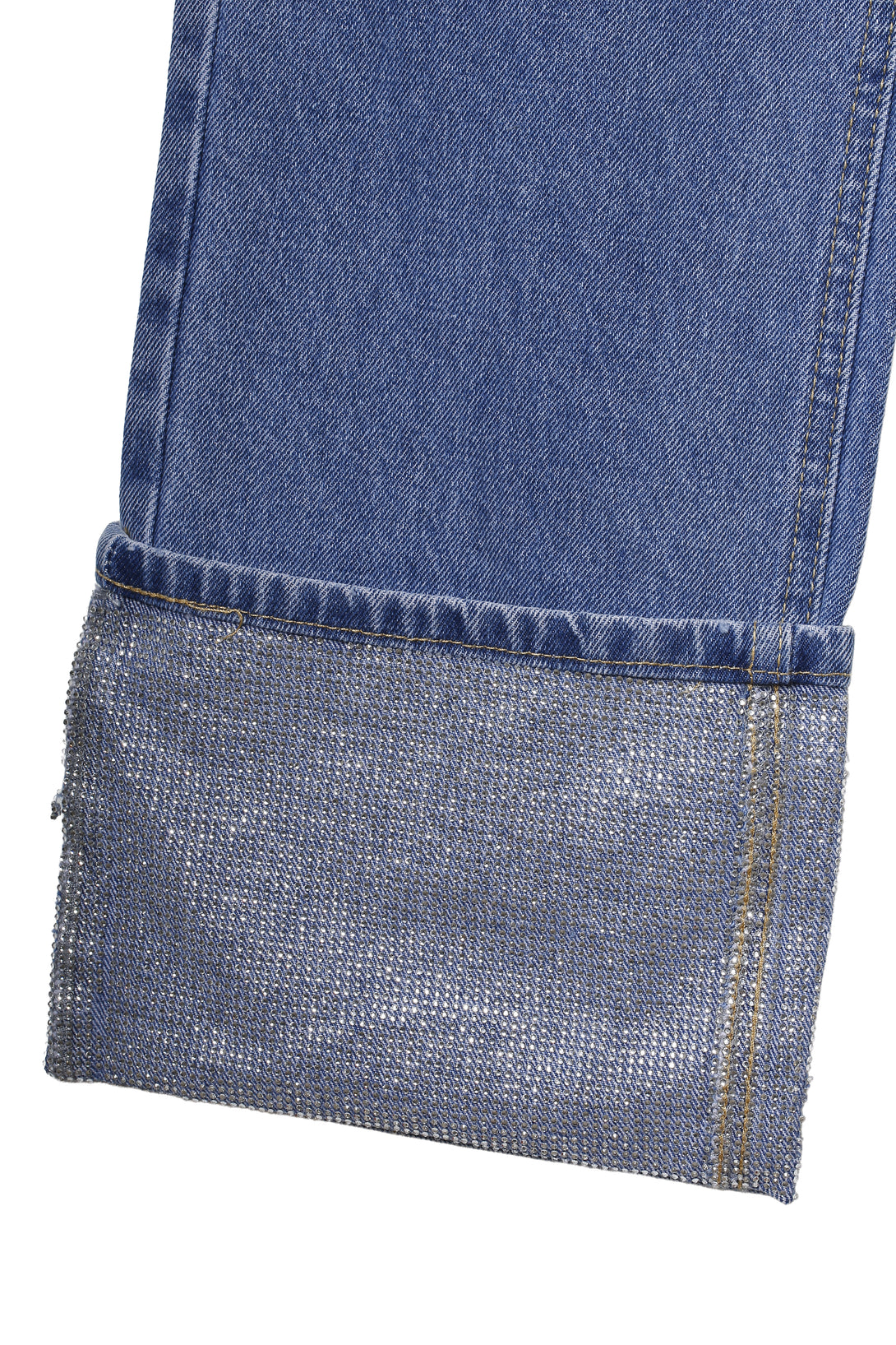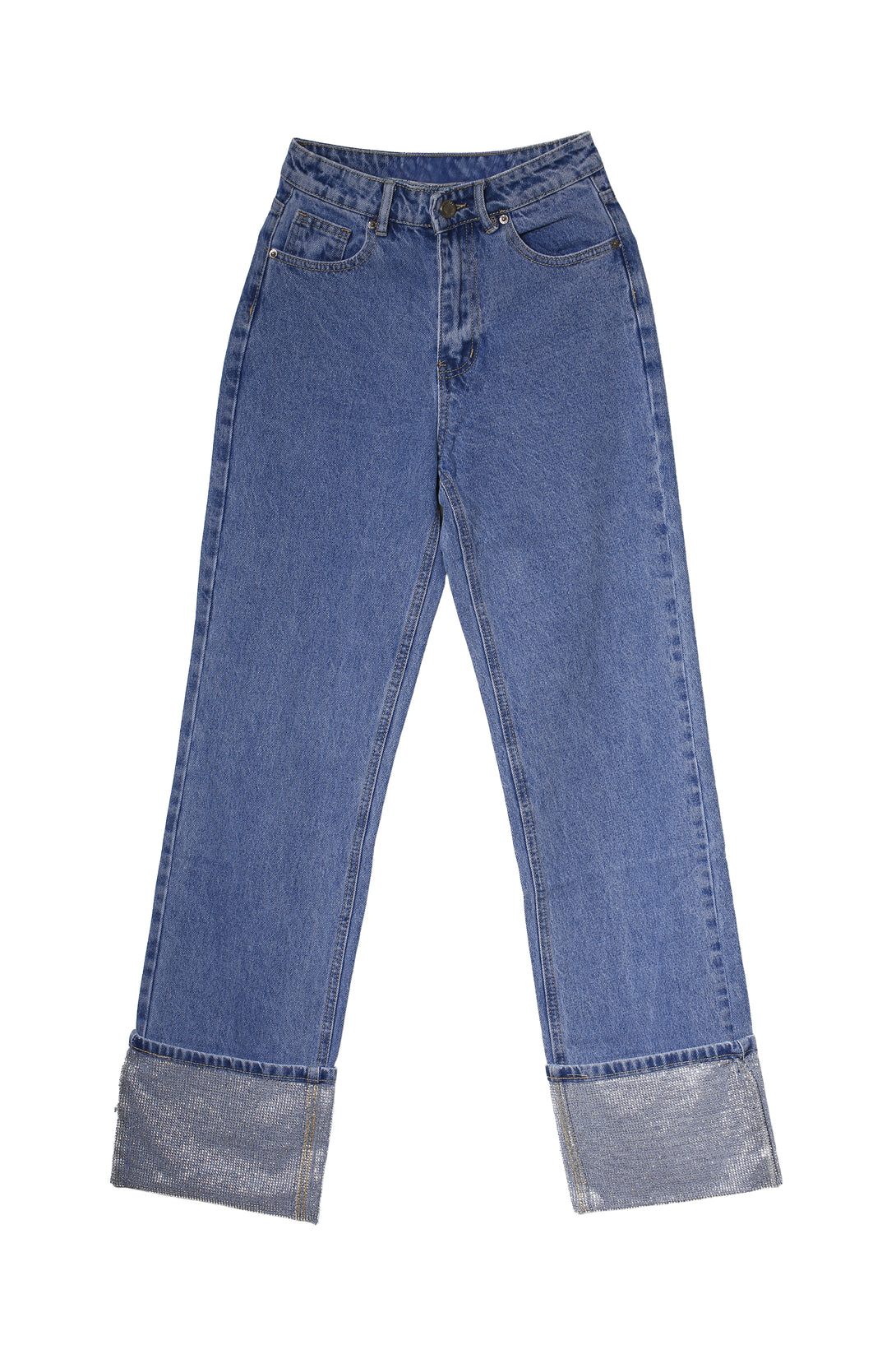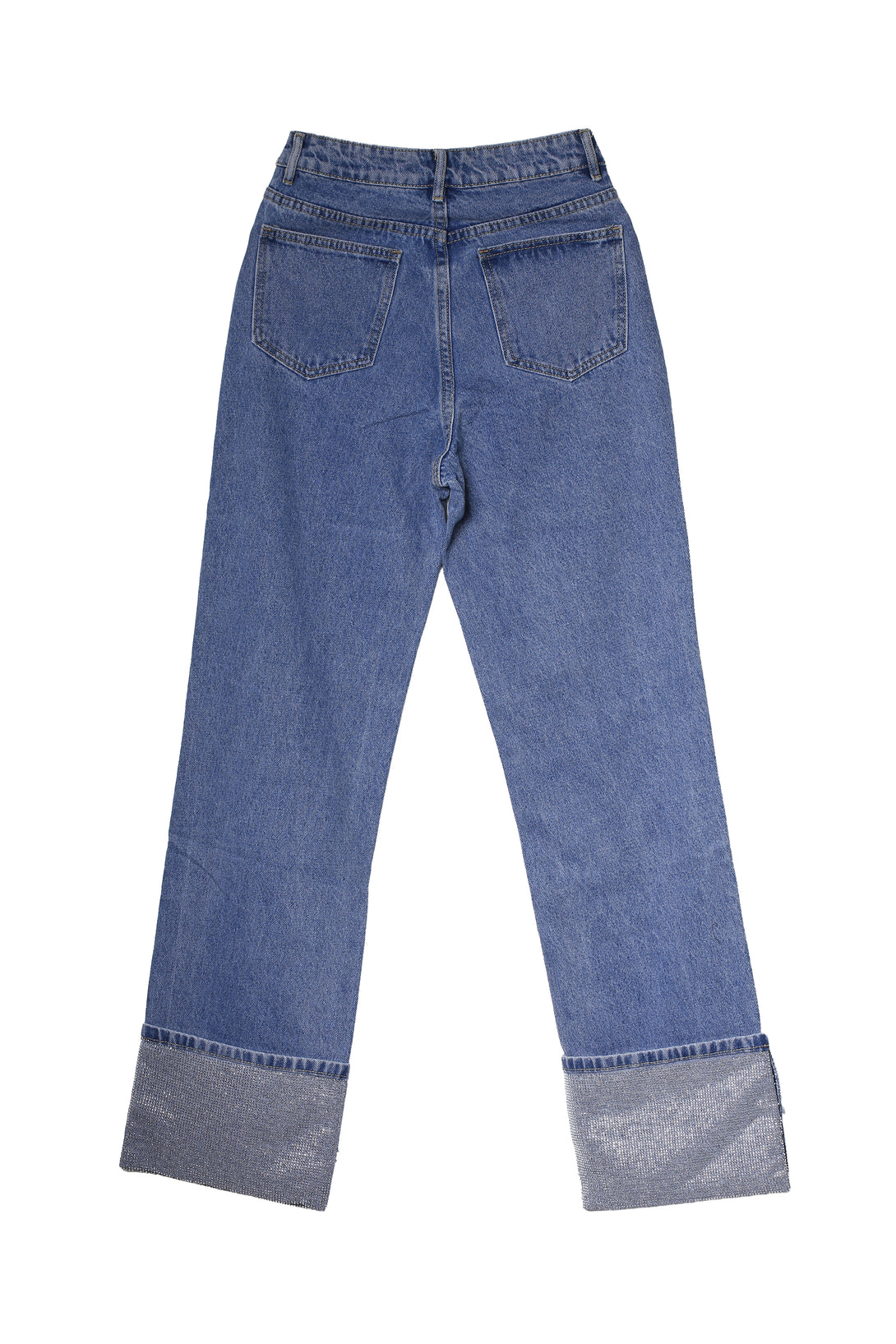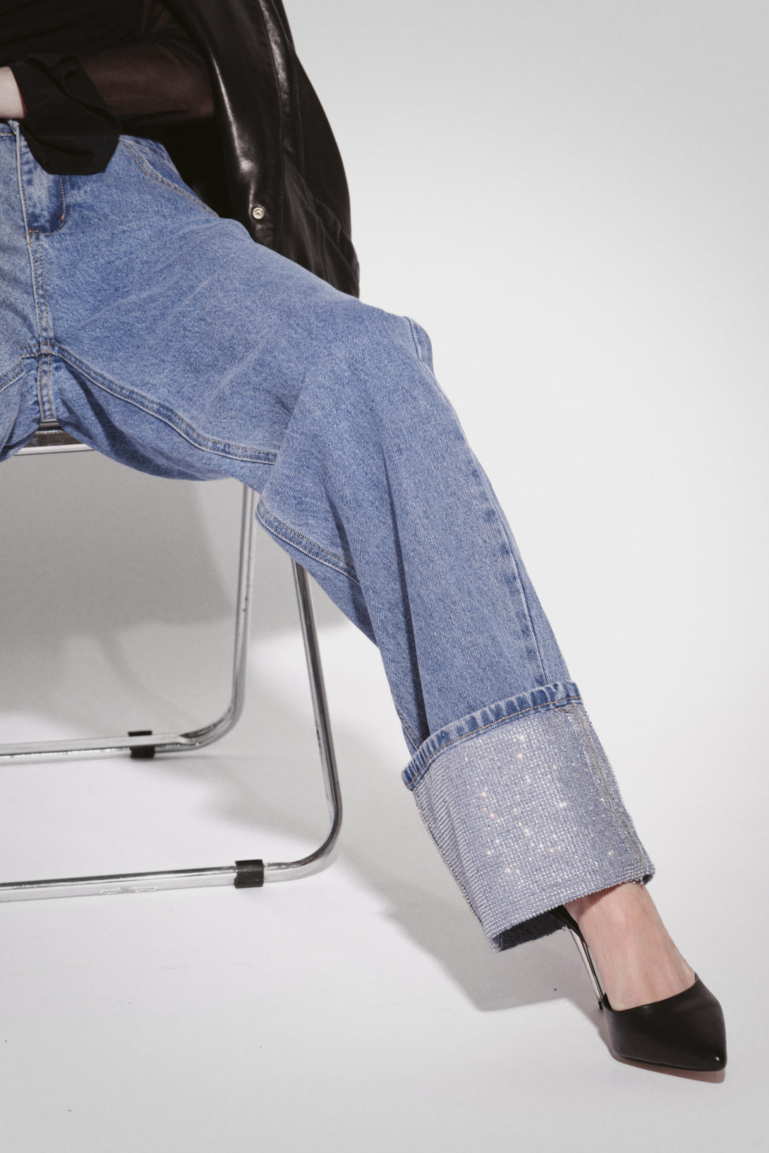 Un jean palazzo que fusiona comodidad y extravagancia. Su silueta amplia fluye con elegancia hasta la bota, donde el recogido sorprende con un acabado deslumbrante: completamente cubierto de pequeños cristales que atrapan la luz en cada paso.