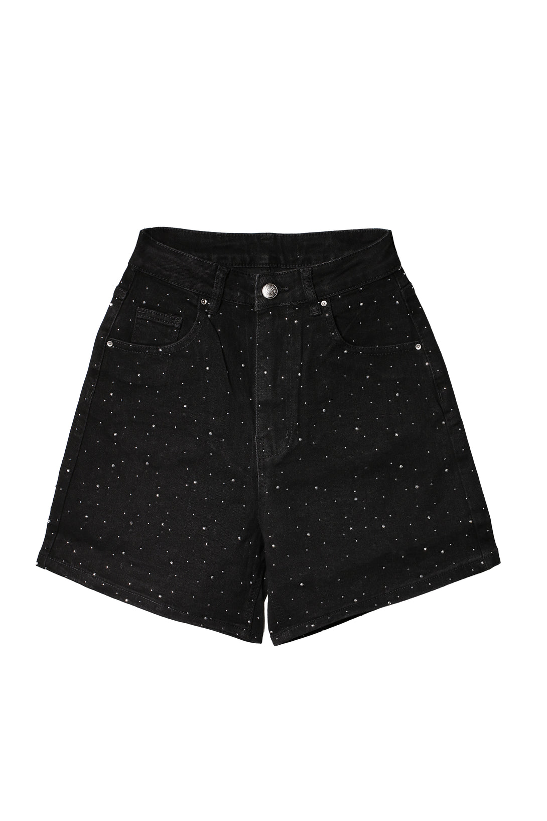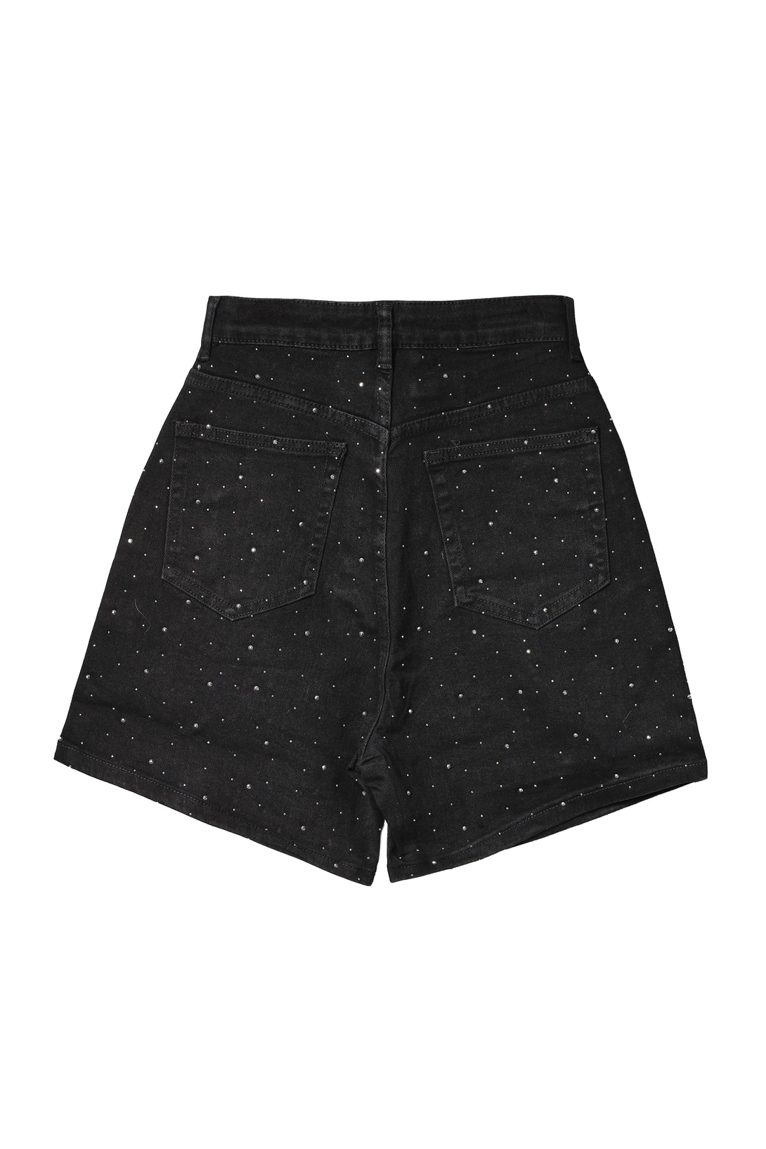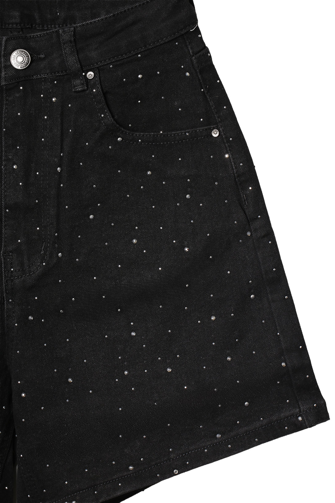 Inspirado en las constelaciones, este short negro de mezclilla incorpora aplicaciones de cristales que evocan un cielo iluminado. Minimalista en su silueta pero cargado de simbolismo, es un básico renovado que conecta moda y luz.