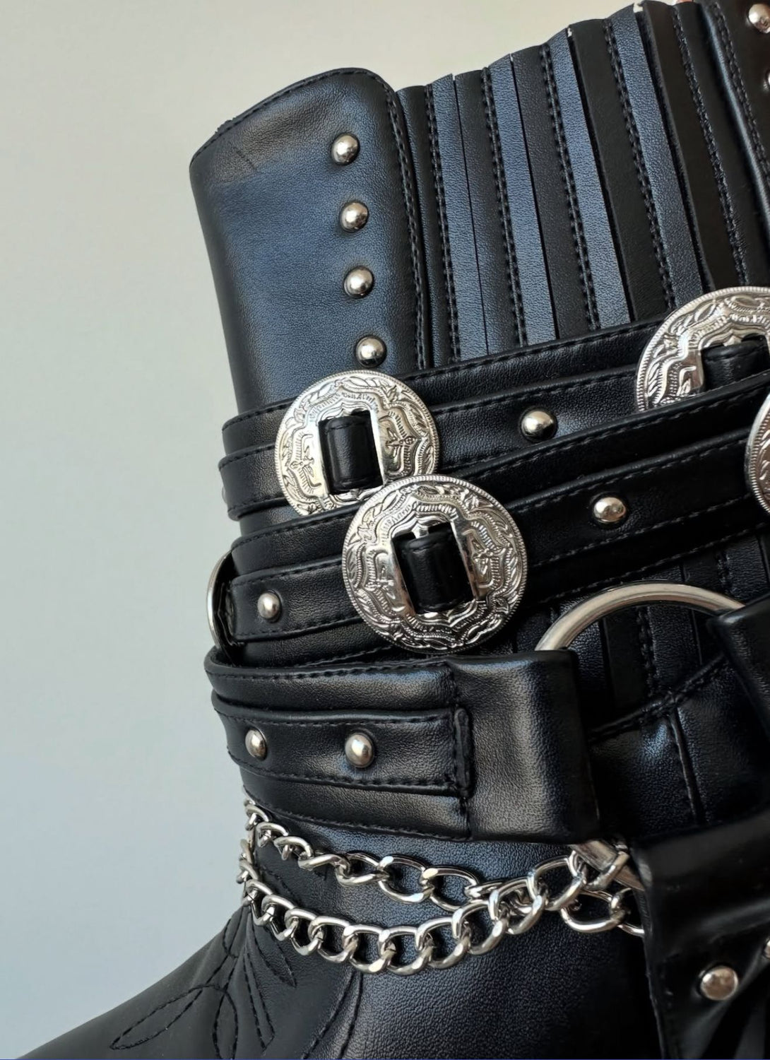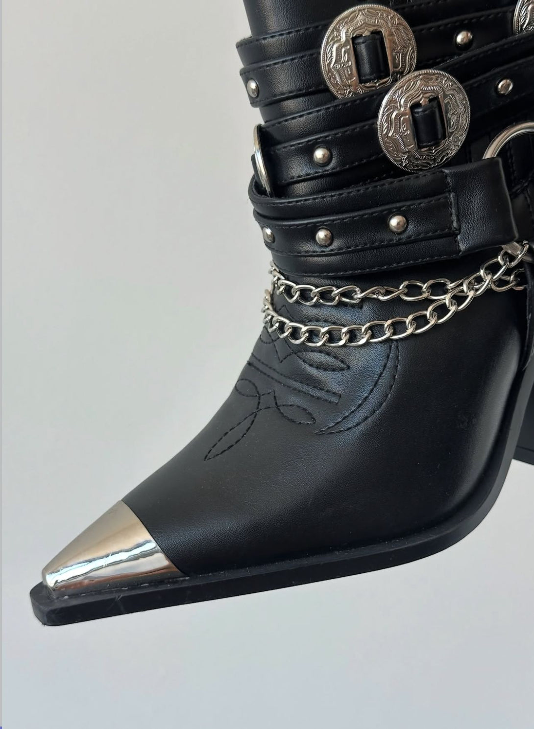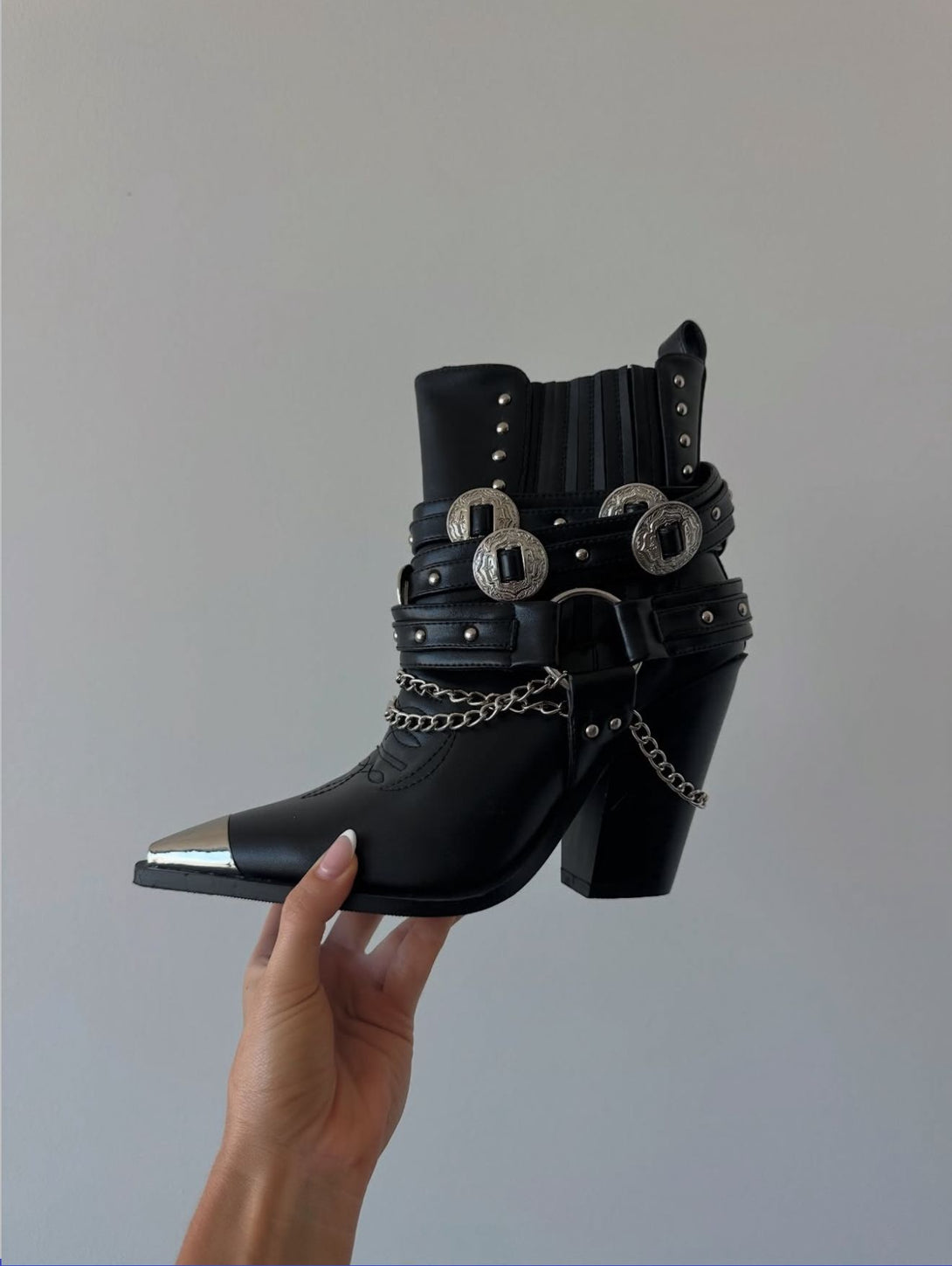 Nuestras Presley Boots cuentan con esencia Seta y silueta contemporánea. Su punta afilada con detalle metálico, tacón ancho y correas superpuestas con hebillas grabadas se complementan con cadenas que evocan fuerza y rebeldía. Un statement piece de SETA que fusiona tradición cowboy con actitud urbana.