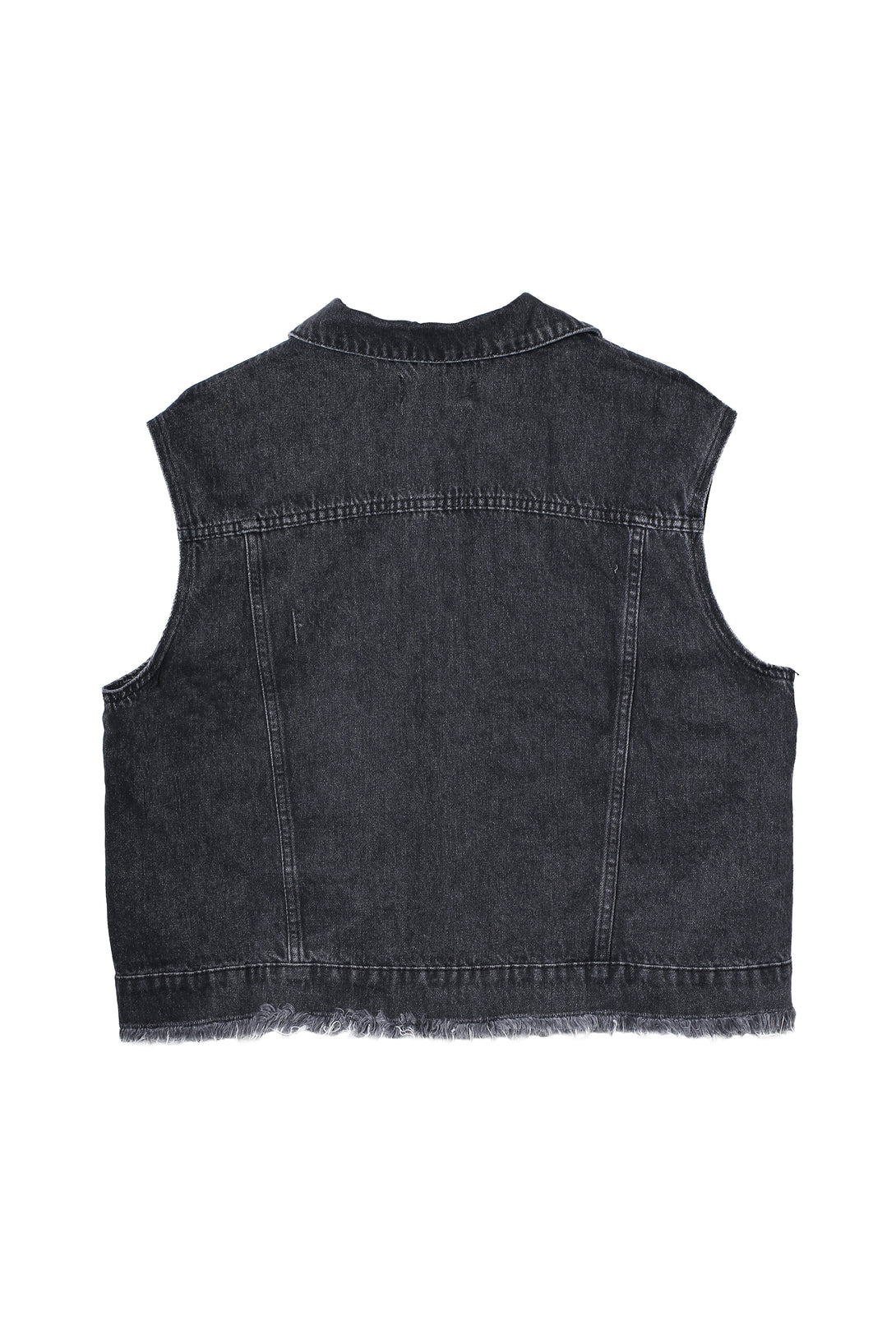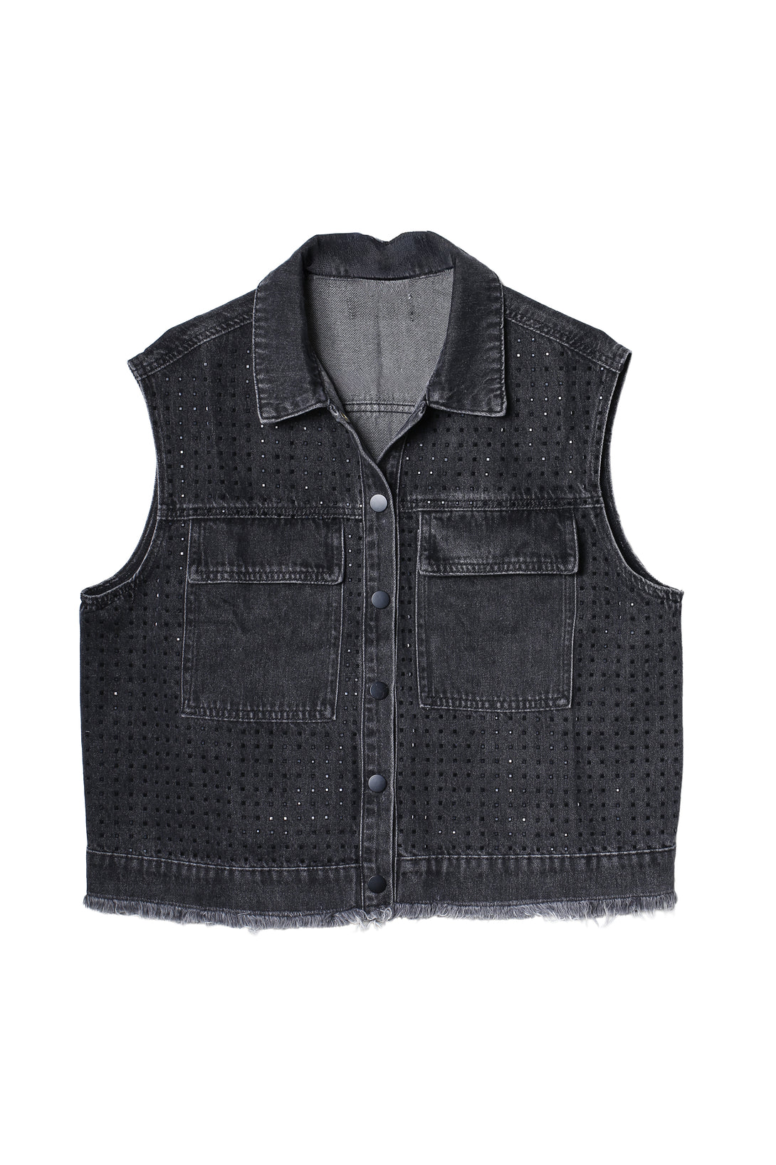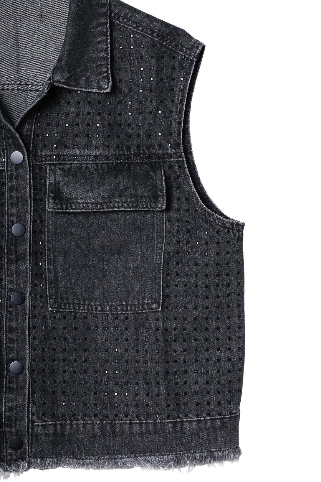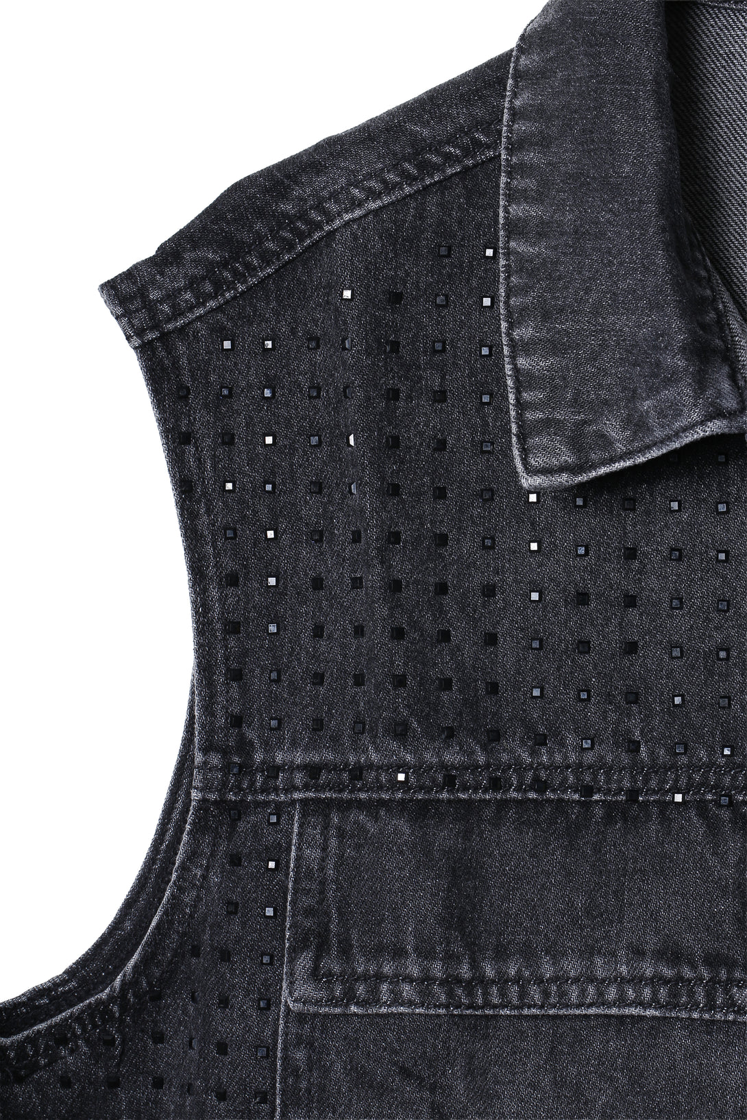 Este chaleco de mezclilla negra se distingue por su diseño estructurado y sus aplicaciones geométricas de microcristales, que generan un efecto futurista sobre una base vintage. Con acabado deslavado, combina lo crudo y lo brillante en una sola prenda.
