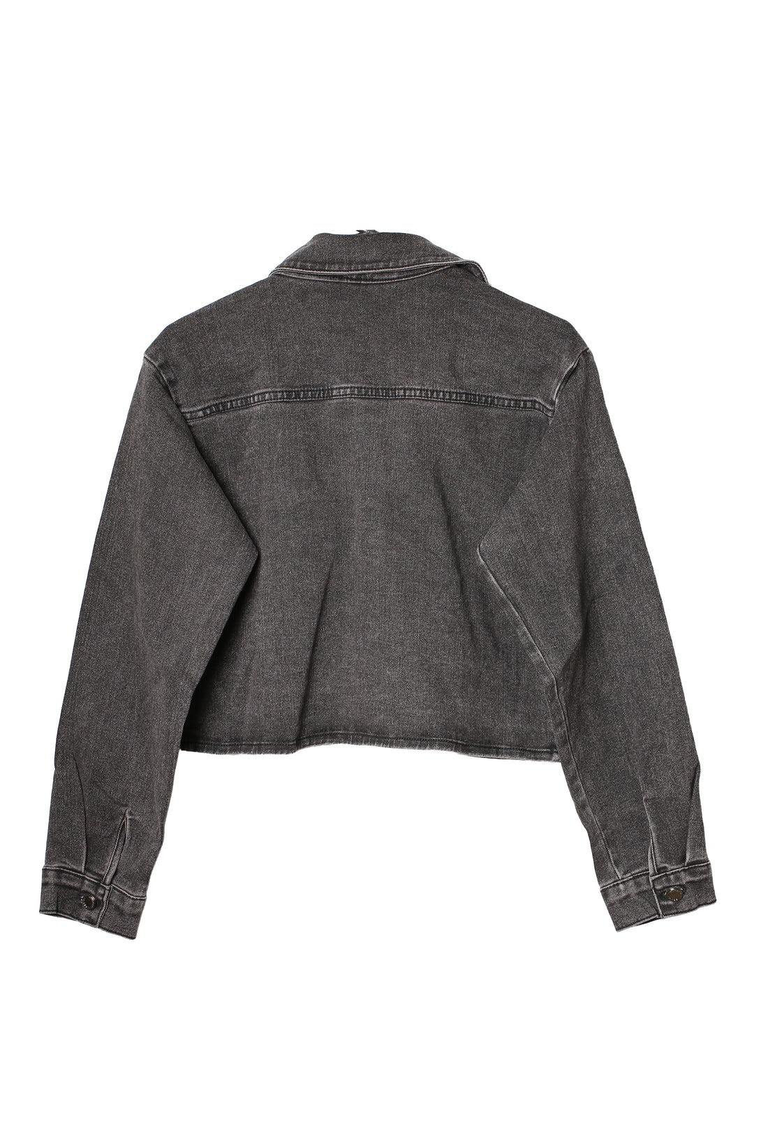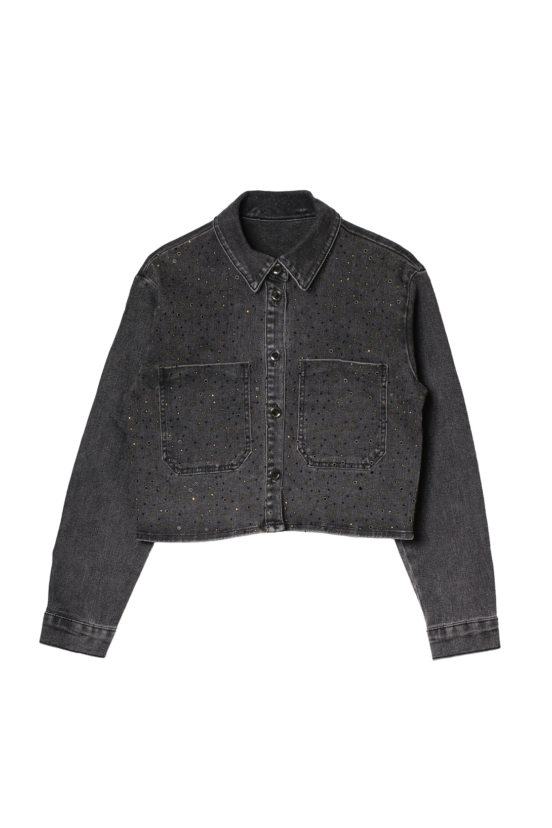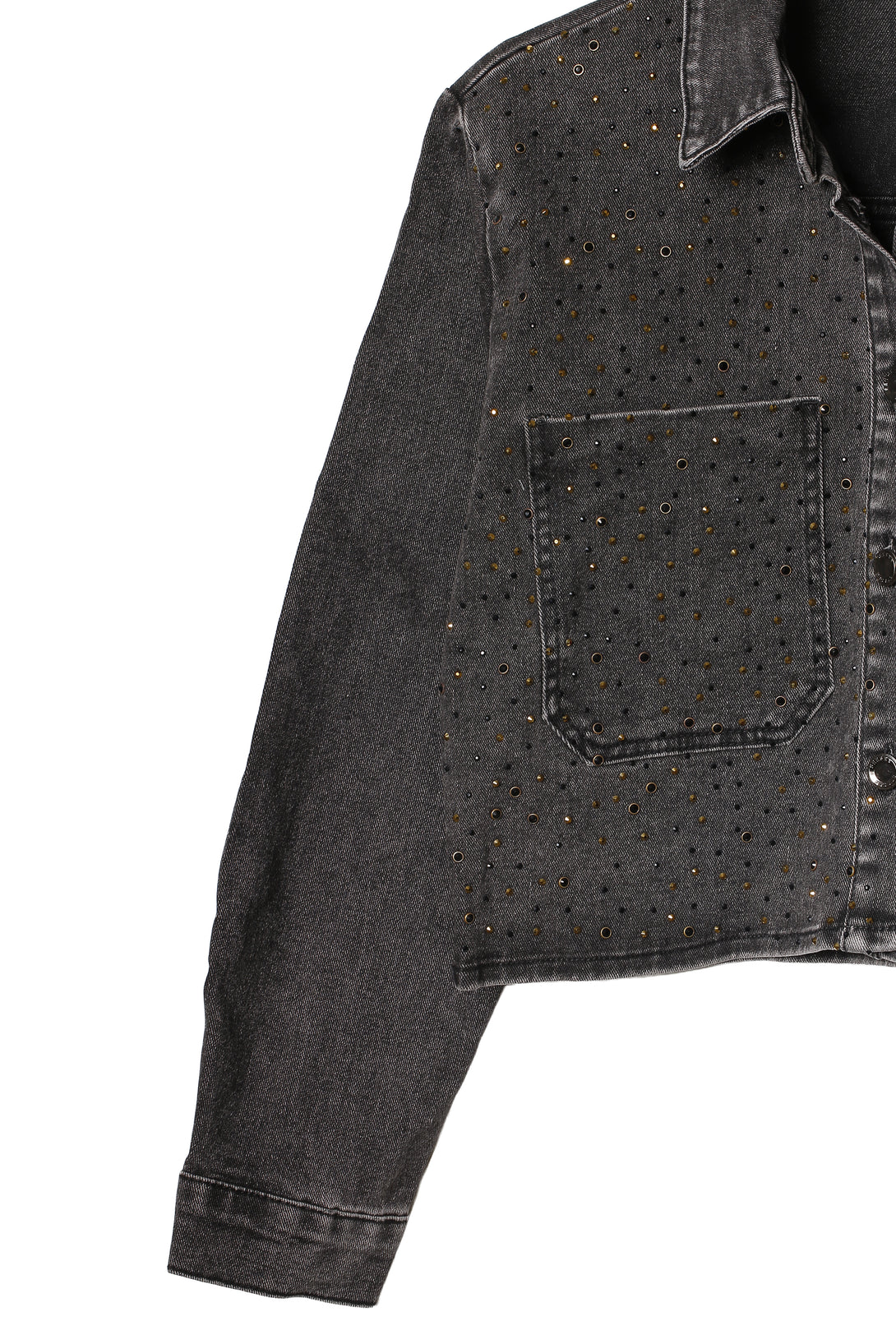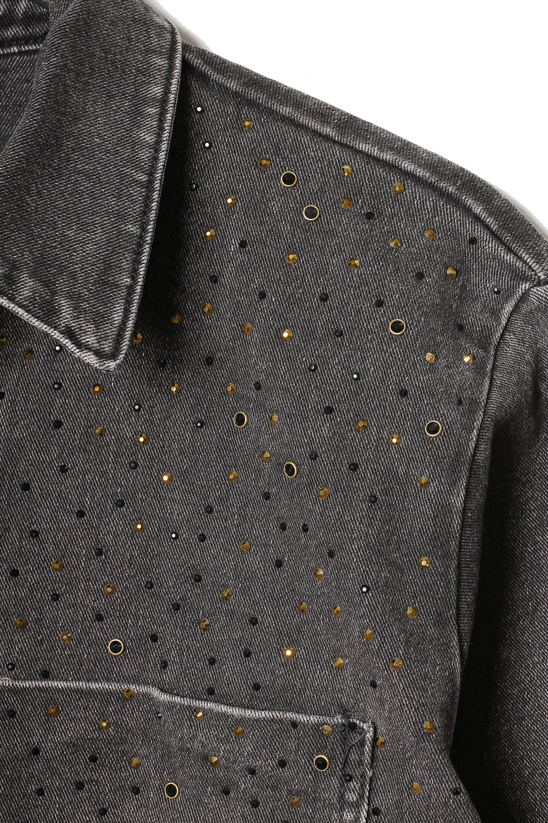 Una camisa crop en denim negro que lleva la rebeldía al terreno del lujo. Su silueta corta y estructurada resalta la actitud urbana, mientras que la superficie cubierta de pequeños cristales dorados y negros crea un efecto luminoso que evoca un cielo estrellado en movimiento.