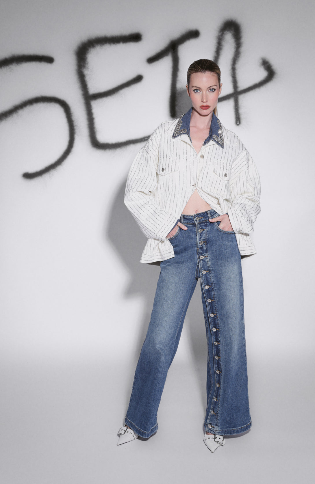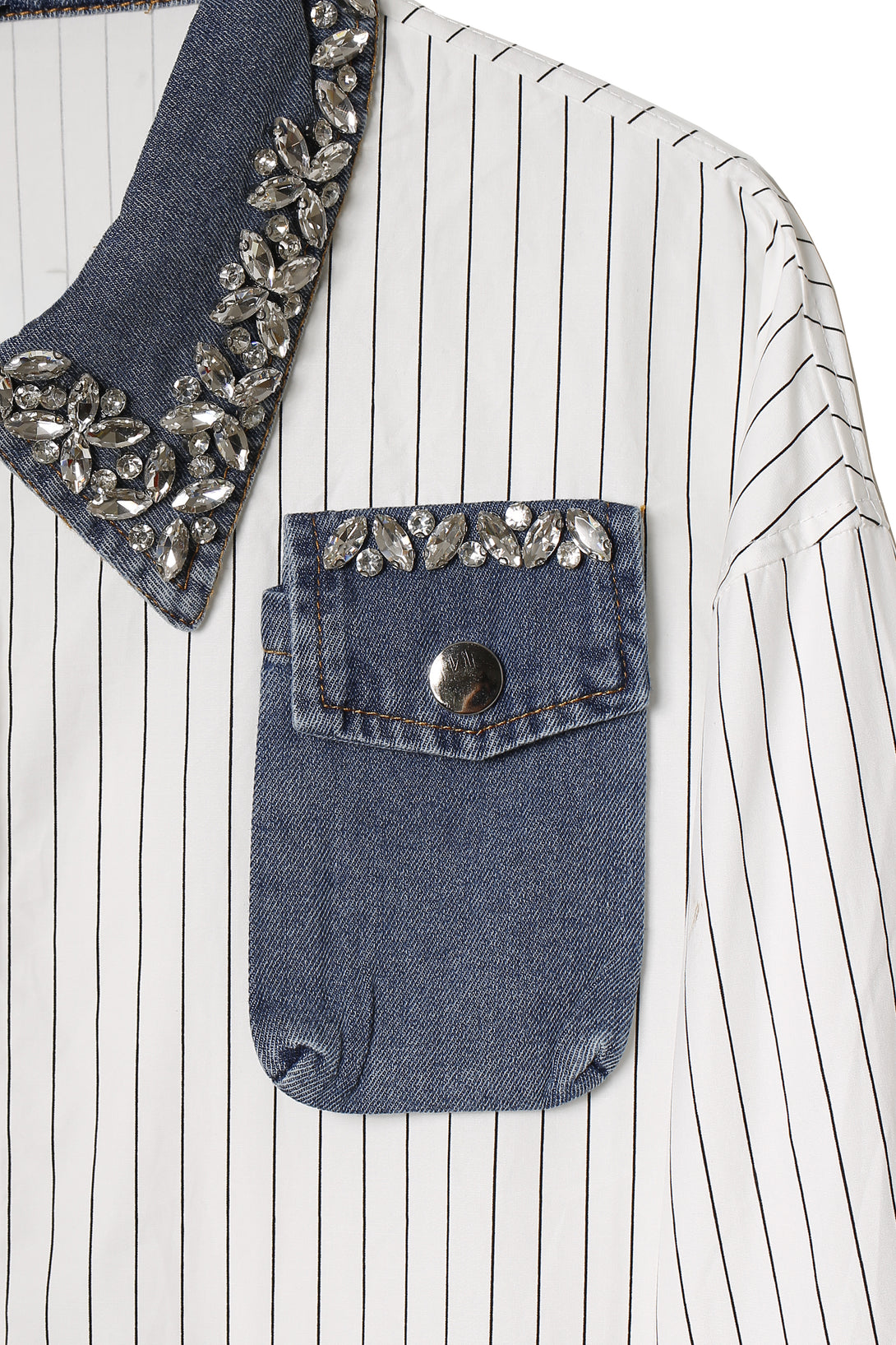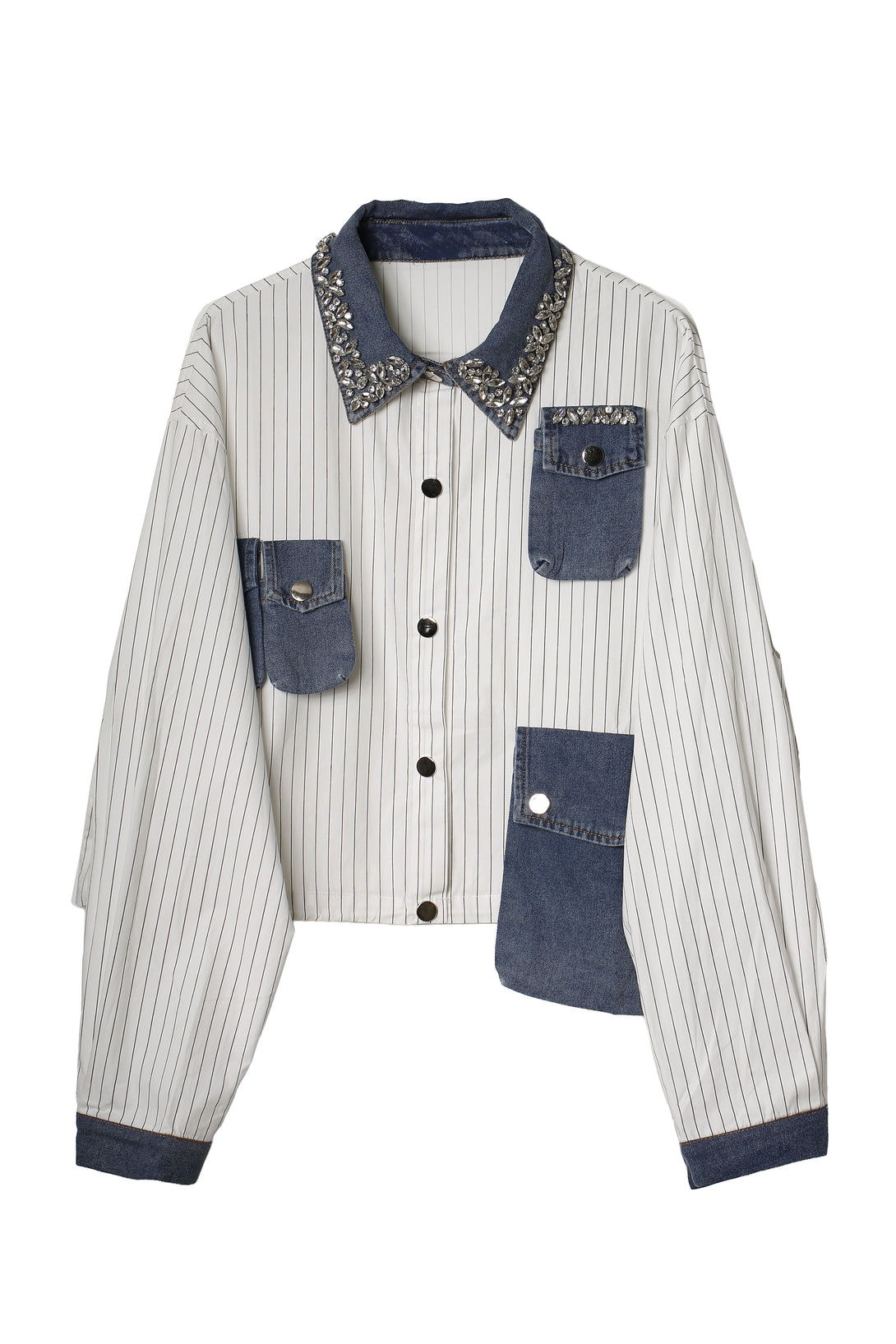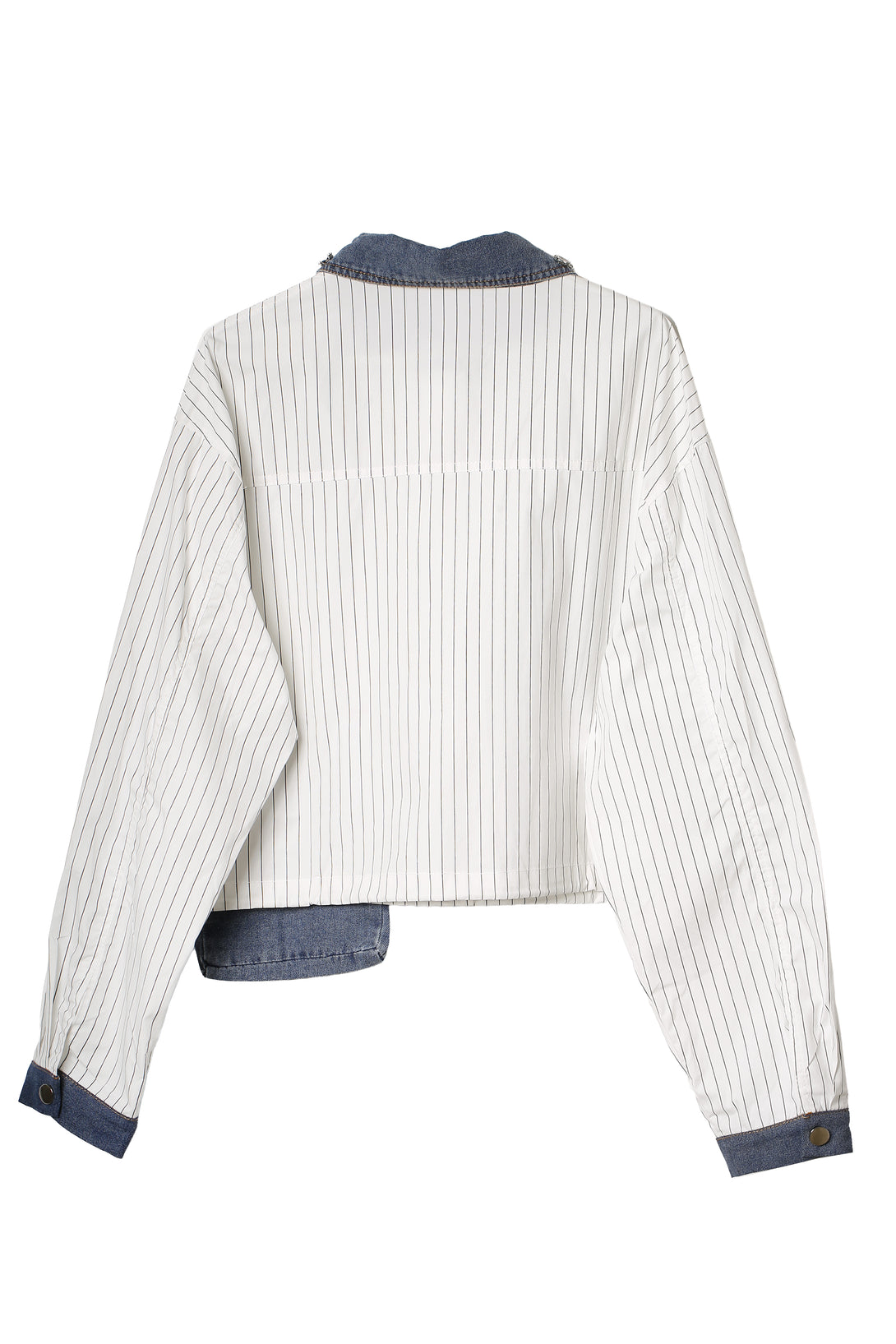 Una chaqueta que redefine la estética urbana con un contraste inesperado. La base en tela blanca con finas líneas verticales crea una silueta limpia y estructurada, mientras que los bolsillos y detalles en denim aportan carácter utilitario.