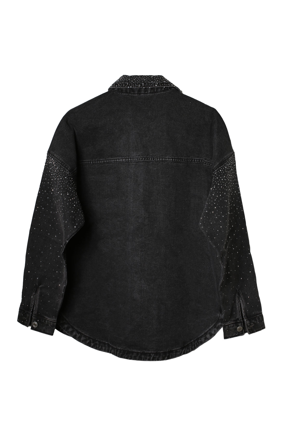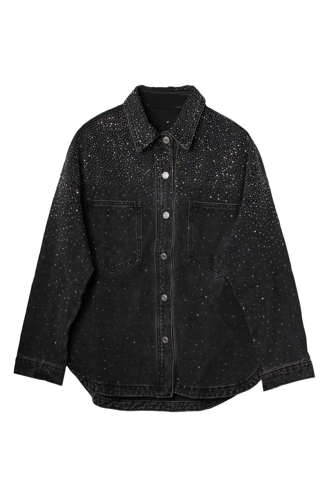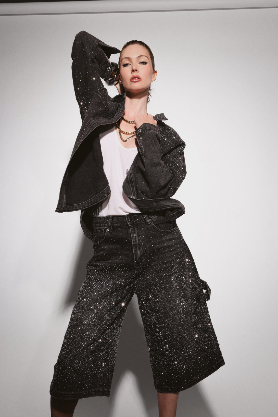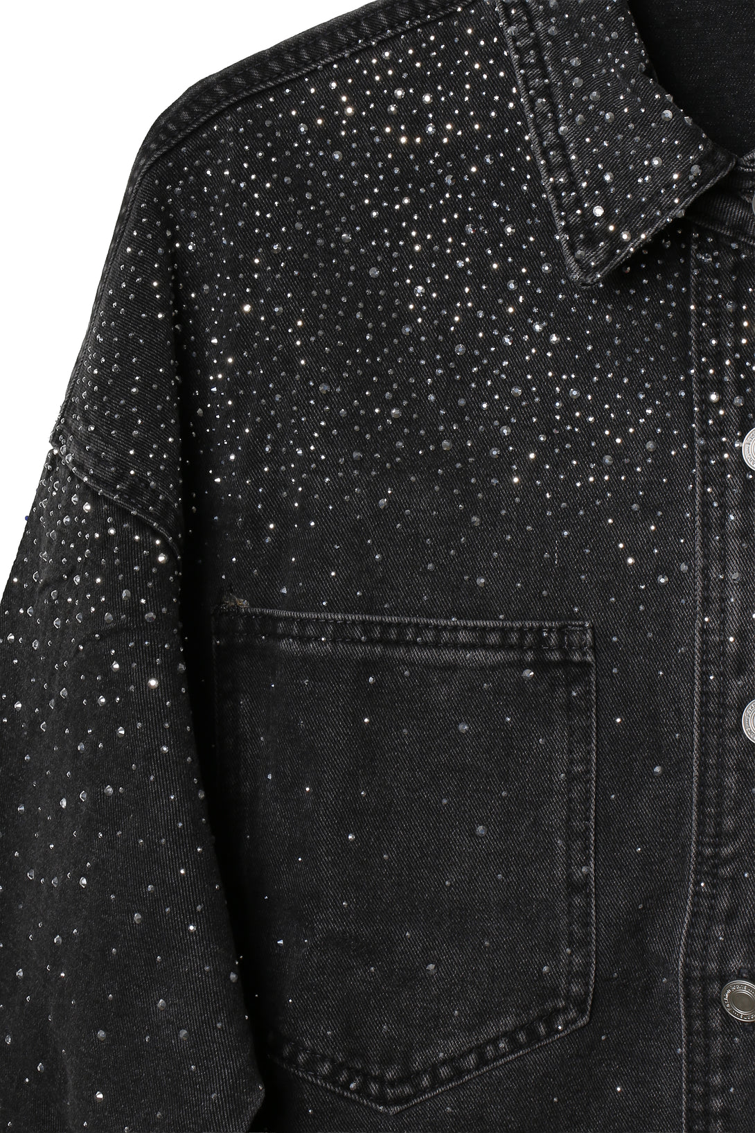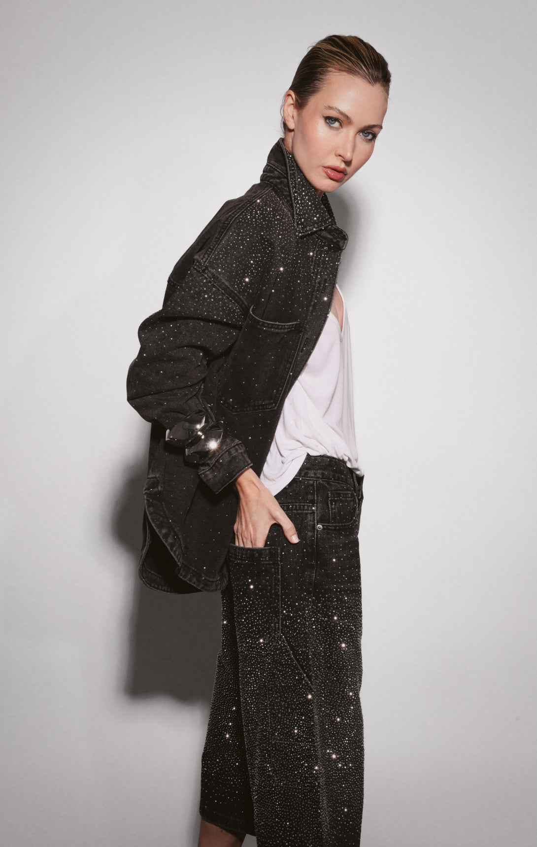 Una camisa oversized de denim negro que se transforma con aplicaciones de microcristales, evocando la sutileza de un cielo estrellado al anochecer. Su silueta amplia aporta libertad y frescura, mientras el brillo sutil la convierte en un esencial con alma poética.